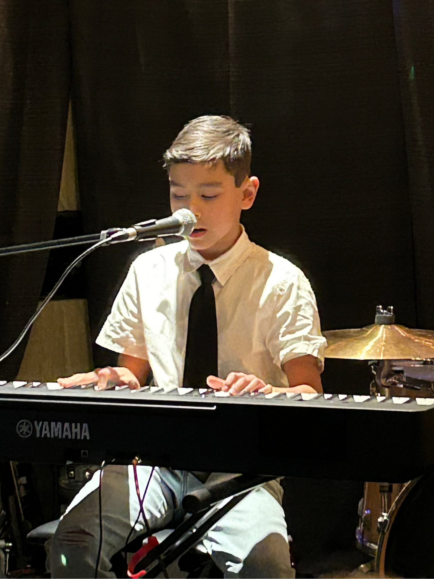Jaxon began as a beginner pianist, inspired by his love for Coldplay. After just 6 months of focused learning, he now plays a wide range of songs—including “Clocks” and “A Sky Full of Stars”—and has developed his singing as well. He’s a regular performer at our shows and a key member of our teen band, contributing backing vocals and playing both piano and keyboards.